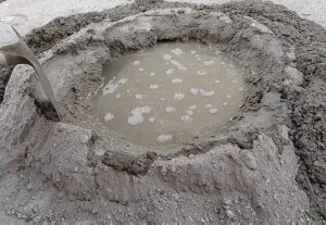 - Imprégnez progressivement le mélange en faisant ébouler les bords intérieurs du cratère dans l’eau à l’aide du dos de la pelle.